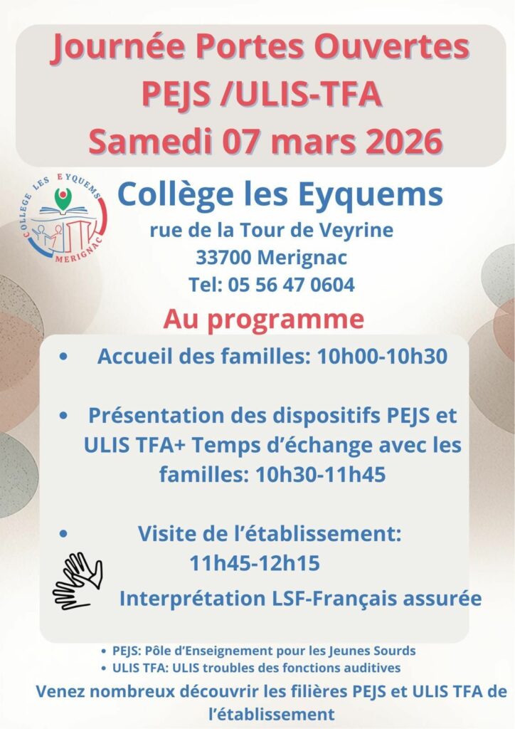 Le collège a ouvert samedi 7 mars 2026 pour présenter le PEJS (pôle d’enseignement des jeunes sourds) et l’ULIS TFA (troubles des fonctions auditives). L’occasion pour les futurs élèves et leurs familles de rencontrer nos élèves actuels et de leur poser des questions, ainsi qu’à leurs parents. L’équipe enseignante a présenté les deux dispositifs ainsi que le collège des Eyquems. Un grand merci à toutes les personnes présentes !